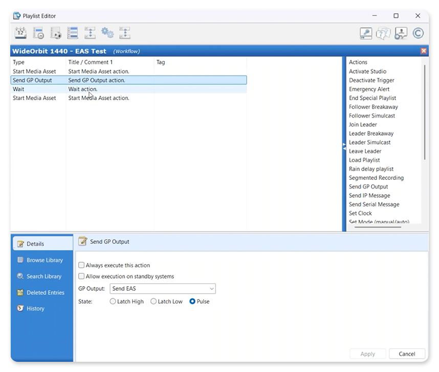 WO Automation for Radio can execute a set of instructions when an EAS message is received. A Special Playlist plays the EAS opening audio, instructs the EAS device to air the EAS the message, and plays the EAS closing audio before returning to regular programming.