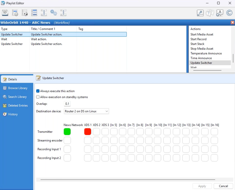 The example workflow below will switch to a national news feed, wait up to 5:05 or for an end of news trigger, then switch back to the news feed and start the stack.